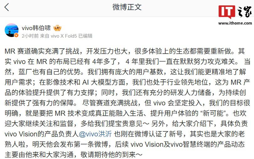 vivo 通讯科技有限公司产物司理韩伯啸本日发文称,MR 许多体验上的生态齐需要再行作念,4 年里一直在沉默奋勉攻克难关,同期 vivo 会坚贞参加,把 MR 工夫形成着实能融入生计、升迁用户体验。IT之家附原文如下: